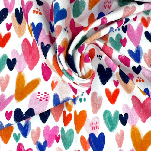 SUper süßer Baumwolljersey mit bunten Herzen auf weißem Untergrund