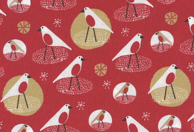 Druckstoff Vögel auf rotem Untergrund aus der Serie Trondheim
