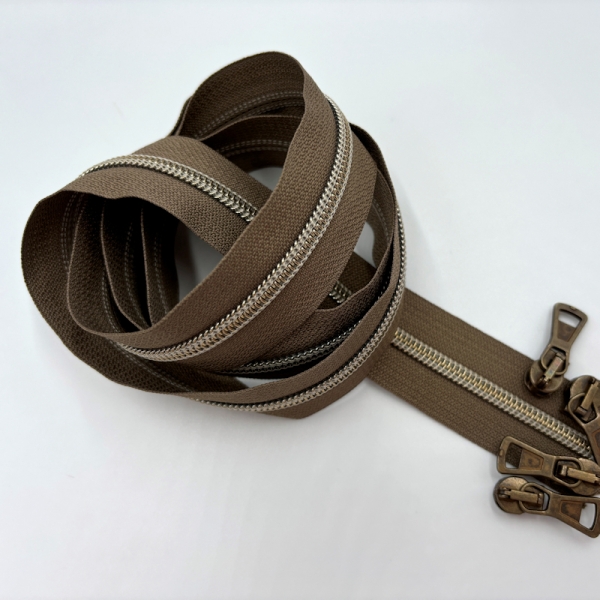 Reißverschluss Meterware mit 6,5 mm Antikmessing metallic Spiralraupe in Aalbraun mit Flachsfarbener Naht.